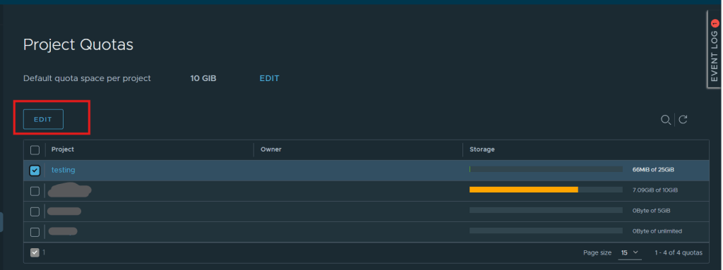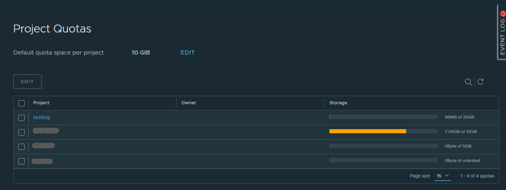The Project Quotas page lists all existing projects with their respective owners and storage usage.