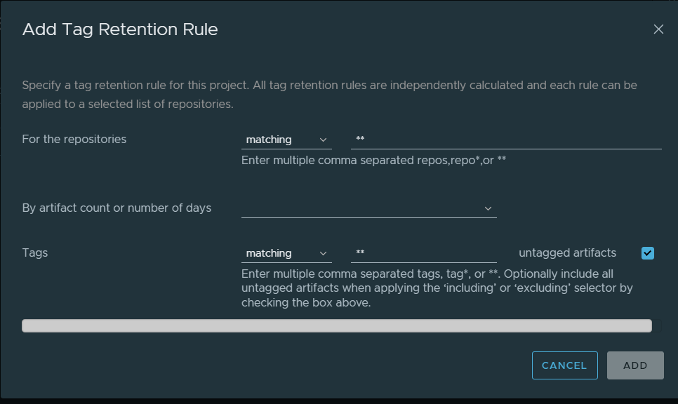 **to include all tags - Rule Type: Select retain the most recently pushed # of artifacts