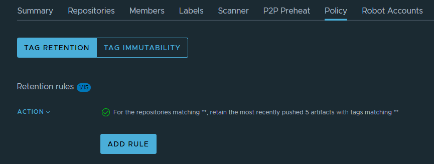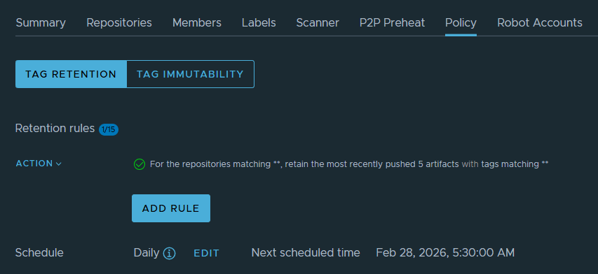 Retention policies in Harbor provide an efficient way to control artifact storage and maintain repository hygiene. By configuring a rule to keep only the last 5 artifacts and scheduling automatic cleanup, you ensure that your container registry remains optimized and well-managed.