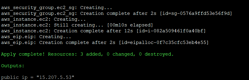 | output “public_ip” { value = aws_eip.eip.public_ip } |