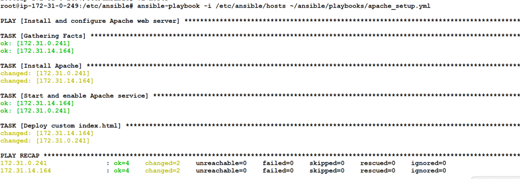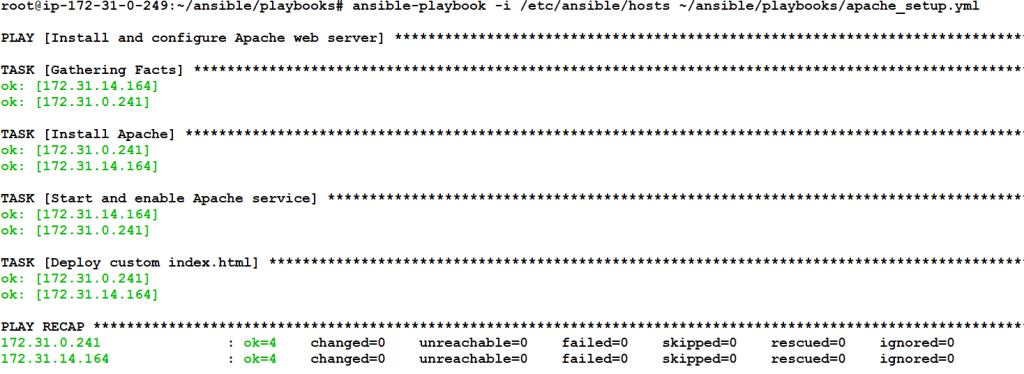 ansible-playbook -i /etc/ansible/hosts ~/ansible/playbooks/apache_setup.ymlYou’ll see most tasks marked as ok, meaning no unnecessary actions were performed.