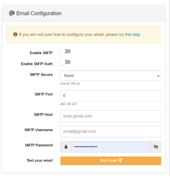 - You can test email sending by going to the admin panel -> Setttings -> Site Settings -> Advanced Configuration, you can find SMTP configuration. Use the following settings.