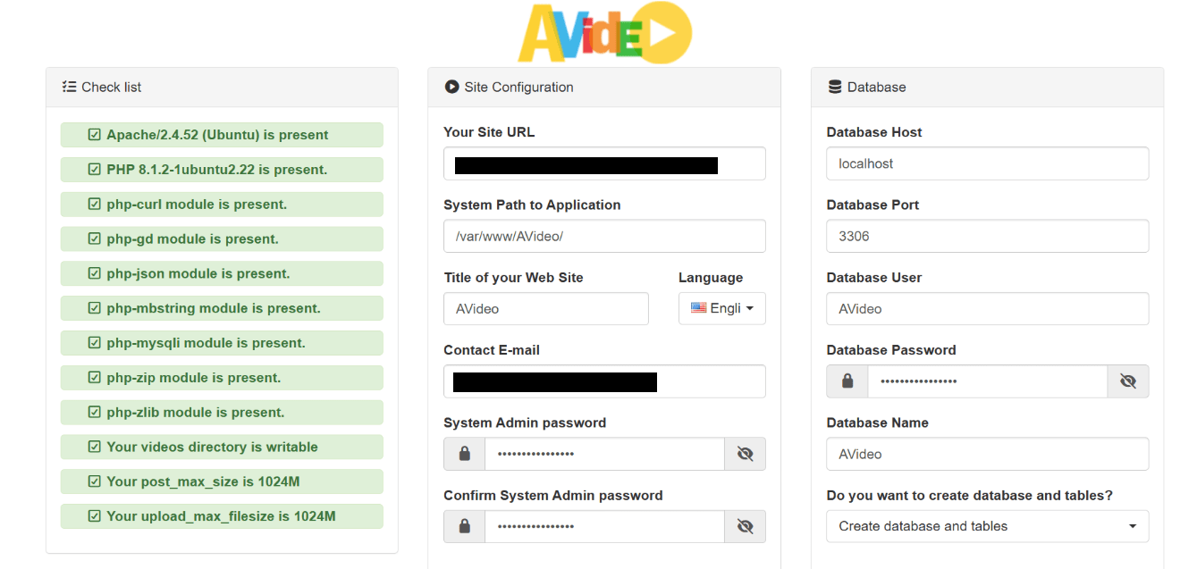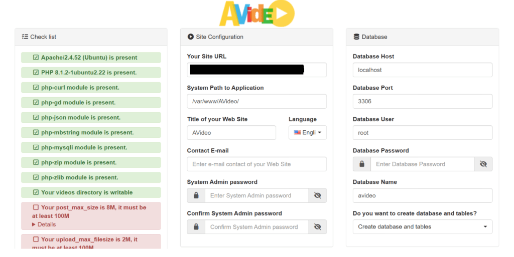 - Now refresh the AVideo install wizard page. Your server should pass all requirements. Now on the right side, you can enter a title your video site, and set a system admin password. Enter the AVideo database name, user and password your created earlier. (Note: You should use the main database, not the encoder database. Also be aware of case-sensitive.)