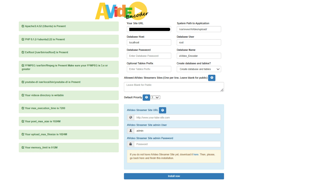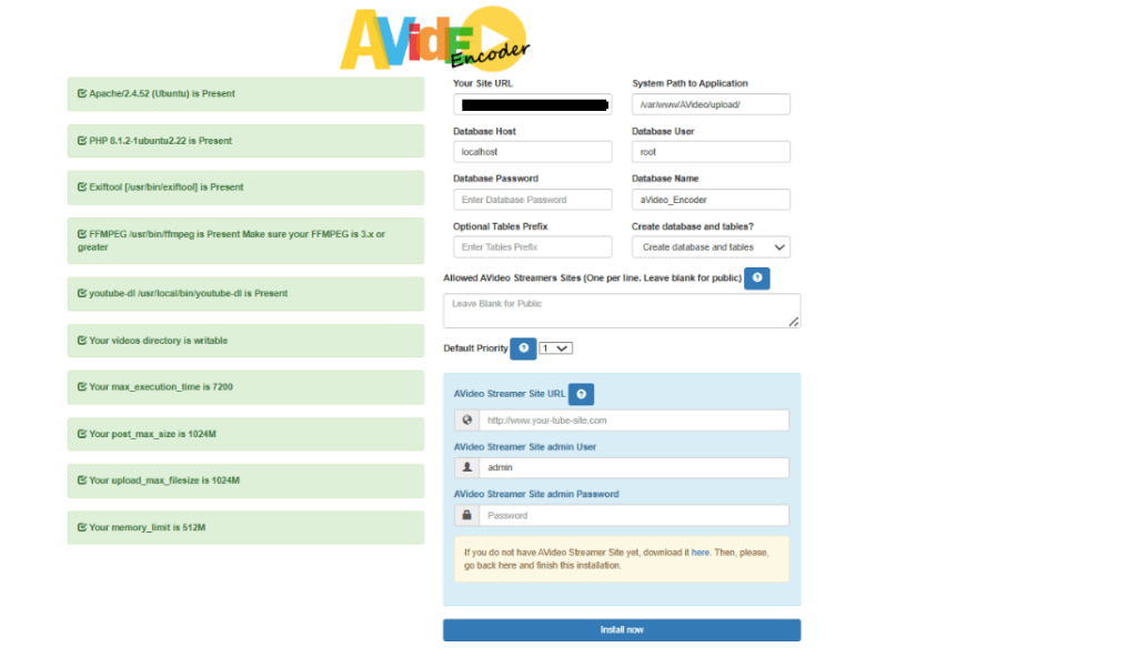 - Now refresh the AVideo Encoder install wizard page. Your server should pass all requirements. Now on the right side, you need to enter the AVideoEncoder database name, user and password your created earlier. Be aware of case-sensitive and enter the streamer site’s admin password.