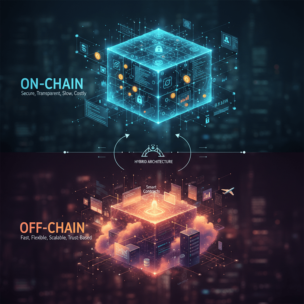Blockchain technology is often described as decentralized and trustless, but in practice, most real-world blockchain applications are built using a combination of on-chain and off-chain systems. Understanding how these two layers work together is essential for building scalable, secure, and user-friendly blockchain platforms.