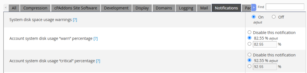 - Set the “Account system disk usage ‘warn’ percentage” to the threshold at which you want to receive an early warning (for example, 80%).