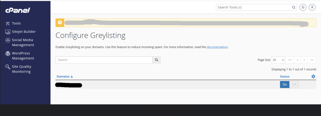 After enabling Greylisting in WHM, the feature is applied to the selected domain immediately.