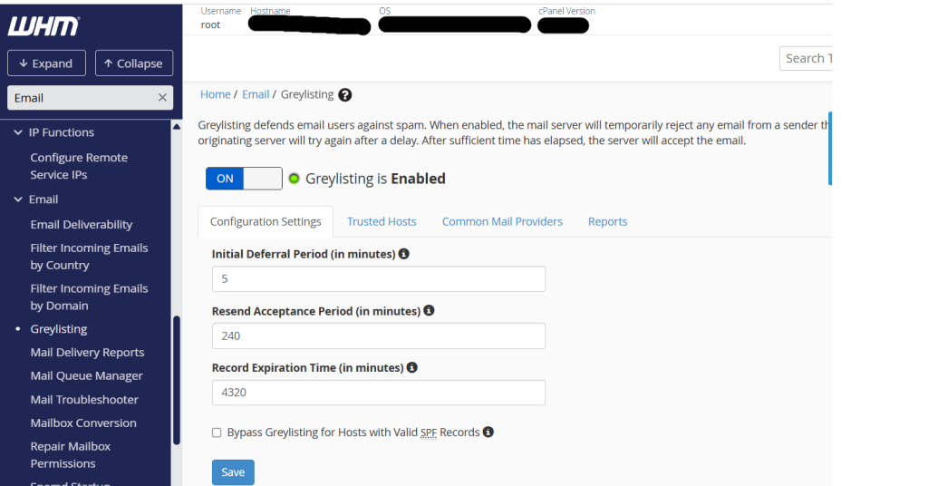 Enabling Greylisting in WHM helps reduce spam by temporarily rejecting emails from unknown senders. The verified senders will retry sending their emails, and these messages are delivered successfully, while most spam is blocked automatically. Keeping the default greylisting settings is safe and effective for most servers. If needed, trusted hosts can be added to ensure that important emails are not delayed. Greylisting provides an extra layer of email security and helps maintain cleaner mailboxes, improving server performance and protecting users from unwanted messages.
